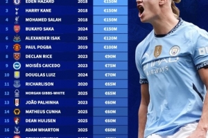 直播吧11月12日讯 德国转会市场盘点了英超各队历史身价最高球员,哈兰德以2亿欧居首,阿扎尔、凯恩、萨拉赫和萨卡均为1.5亿欧。